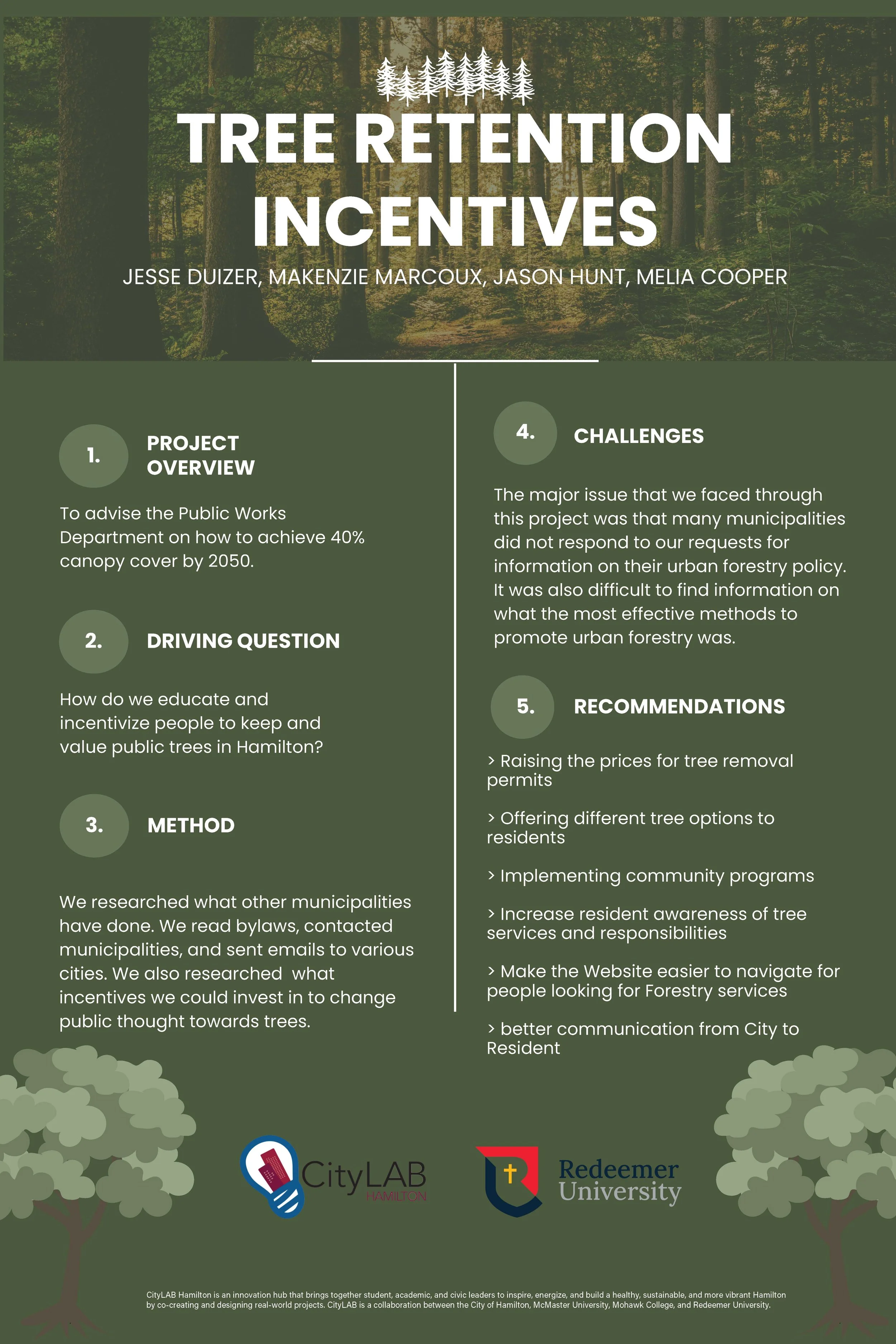 Project Description: The City of Hamilton issues permits for any works that will affect a public tree in accordance with the City's Public Tree By-Law. The City wants to encourage applicants to preserve existing trees and to plant new trees. The focus of this project is to undertake a review of the practices used in other municipalities for offsetting fees (or “incentives”) for planting new trees, protecting existing trees based on development type. Key project tasks include reviewing and collecting information on what other municipalities are doing, conducting interviews with municipalities, and provide an analysis of the data collected.
