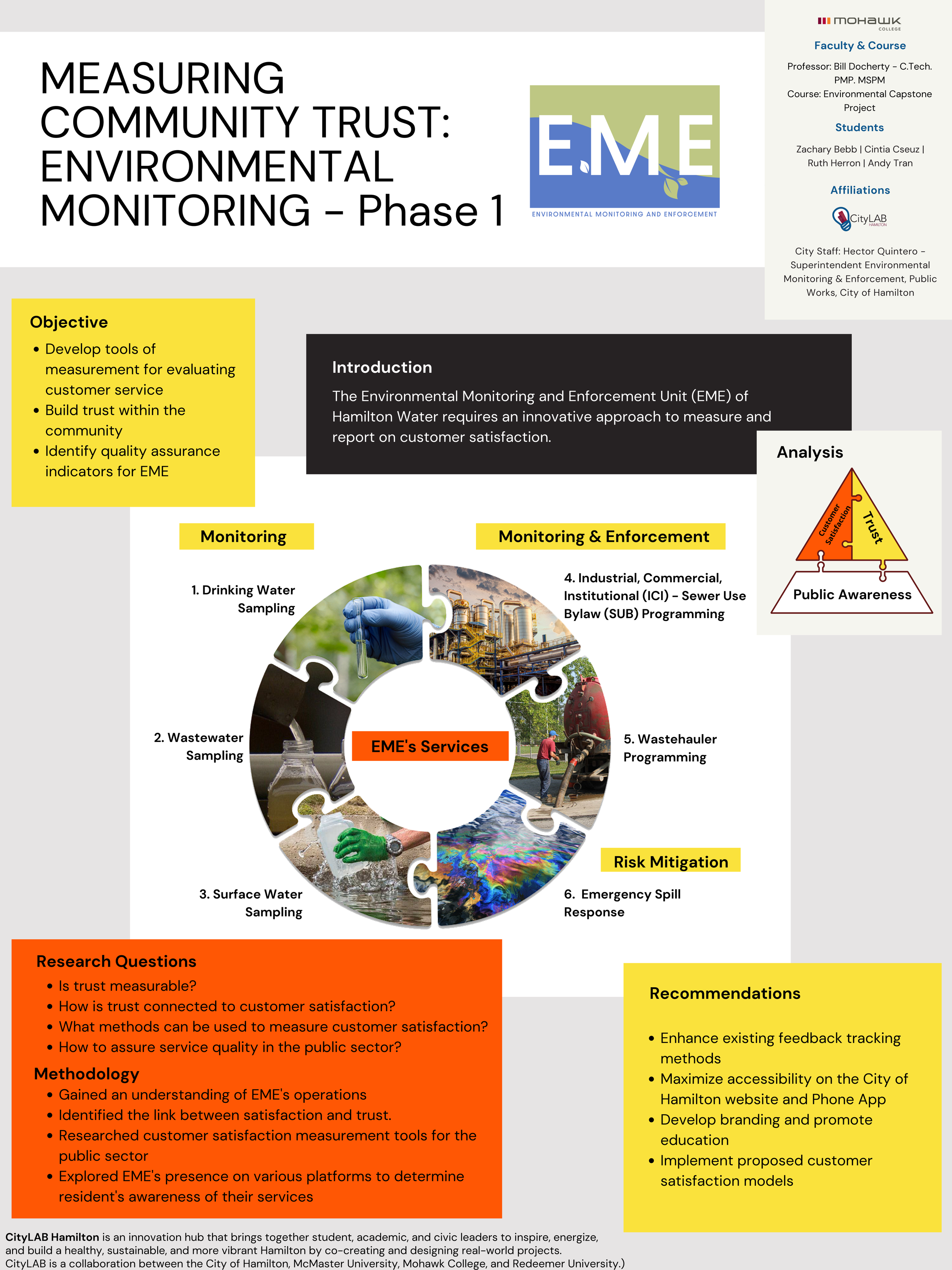 The EME of Hamilton Water requires an innovative approach to measure and report on customer satisfaction. The EME unit is responsible for delivering broad services including regulatory drinking water sampling, regulatory wastewater sampling, sewer use bylaw administration and enforcement, wastewater abatement bylaw administration, emergency spill response and surface waters monitoring.